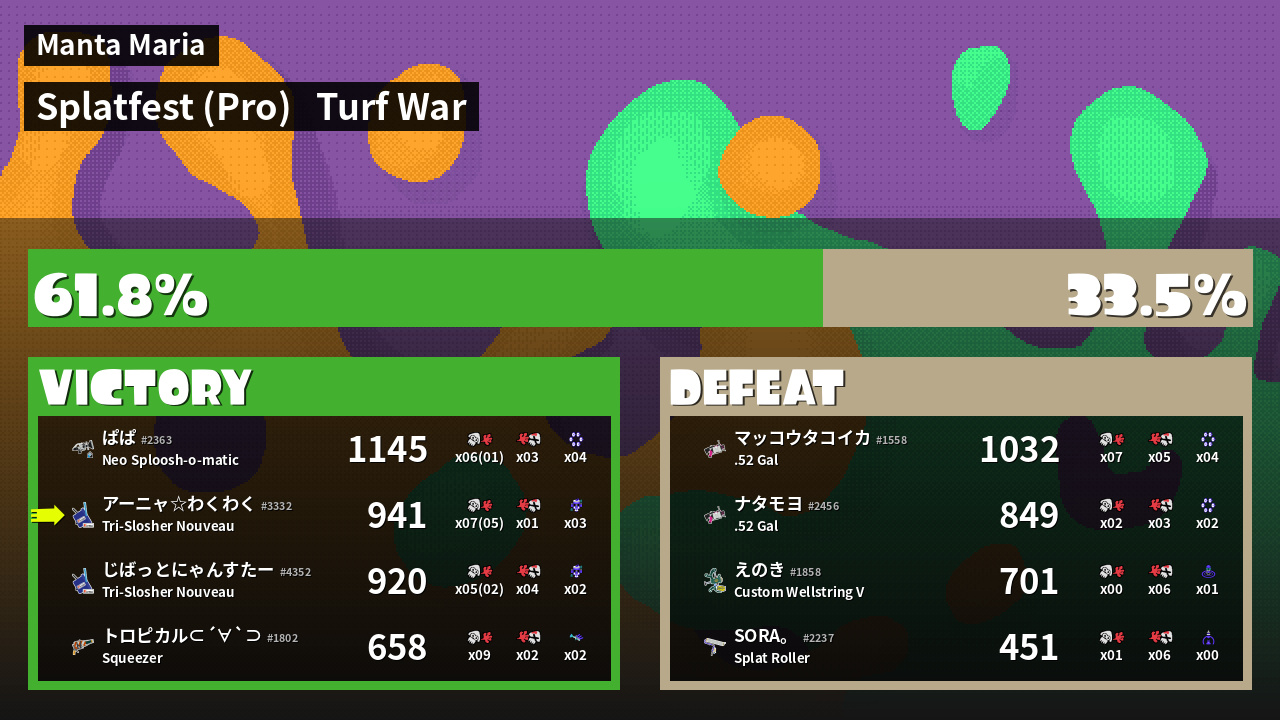 | Mode | Turf War - Splatfest (Pro) | ||