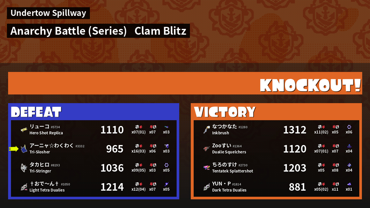 | Medals | #1 Overall Splatter #1 Enemy Splatter #1 Clam Stopper | ||