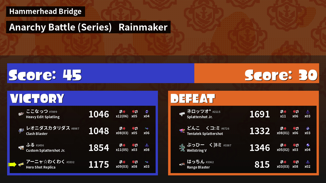 | Medals | #1 Enemy Splatter #1 Rainmaker Stopper #1 Trizooka User | ||
