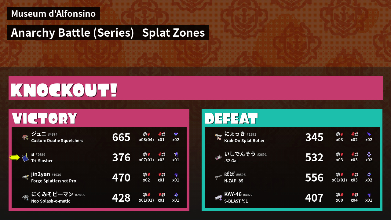 | Medals | #1 Enemy Splatter #2 Overall Splatter #2 Splat Zone Guard | ||