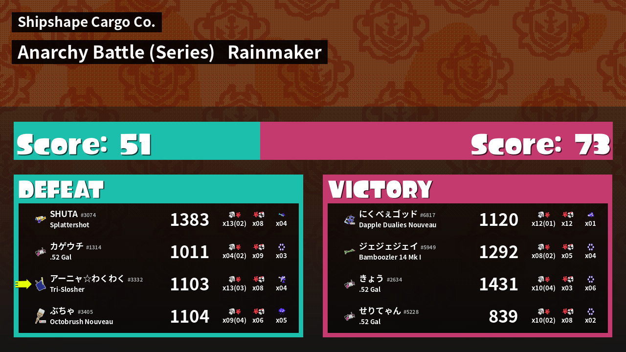 | Medals | #1 Overall Splatter #1 Super Jump Spot #1 Damage Taker | ||
