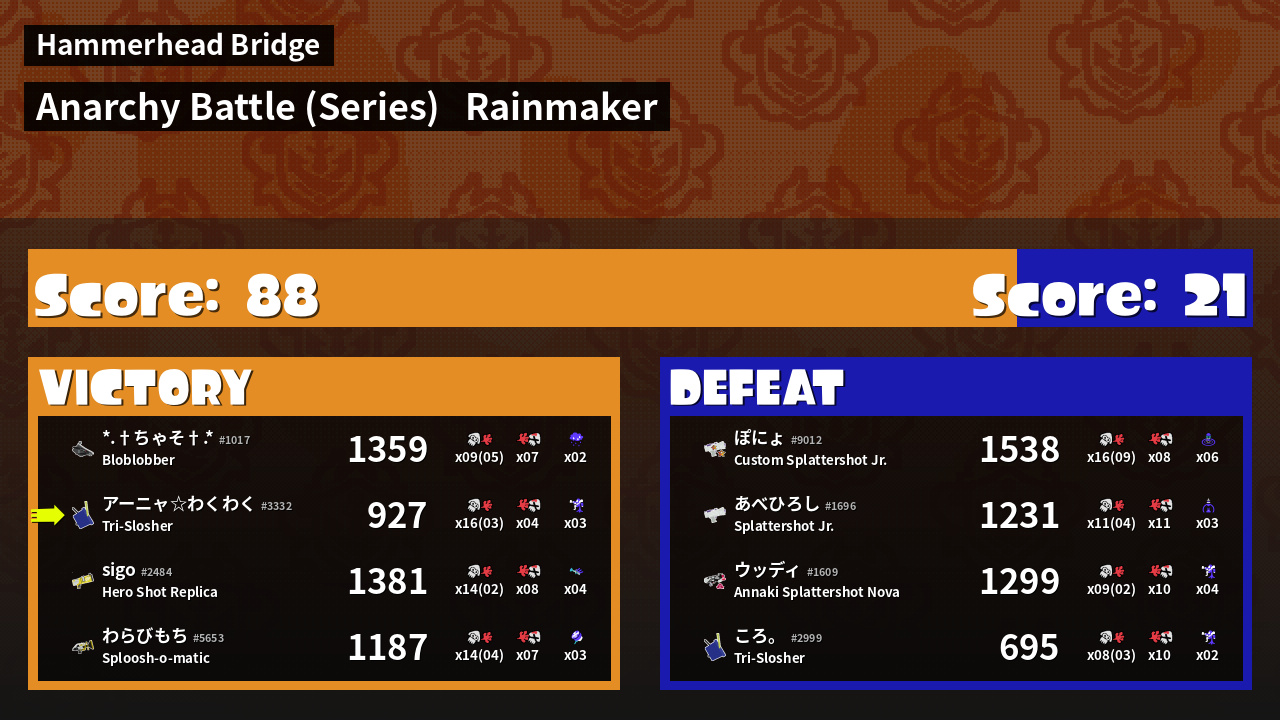 | Medals | #1 Overall Splatter #1 Enemy Splatter #1 Rainmaker Stopper | ||