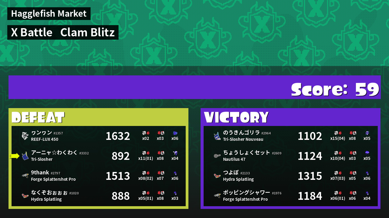 | Medals | #1 Overall Splatter #1 Enemy Splatter #1 Clam Stopper | ||