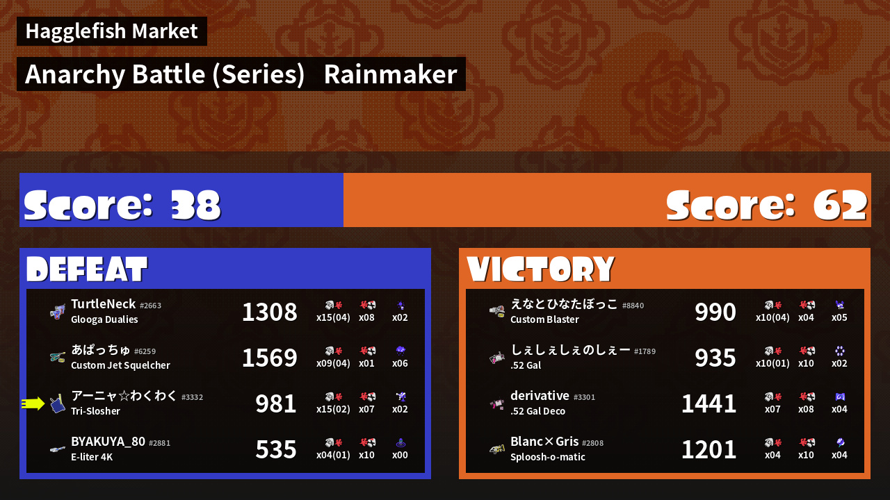 | Medals | #1 Overall Splatter #1 Enemy Splatter #1 Rainmaker Stopper | ||