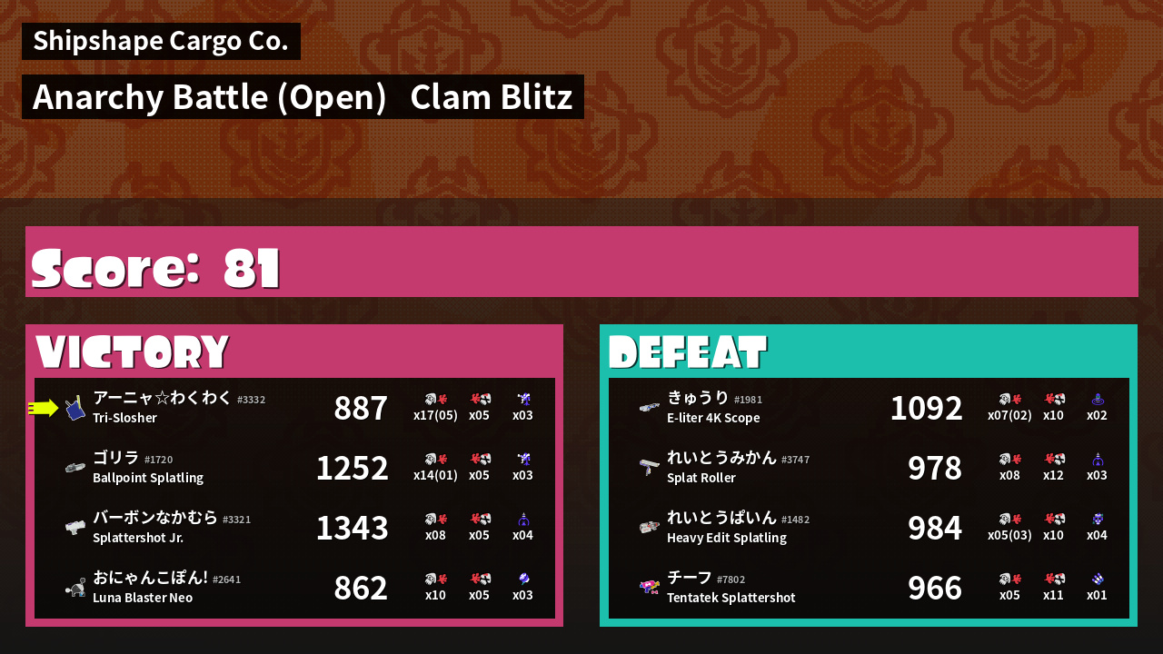 | Mode | Clam Blitz - Anarchy Battle (Open) | ||