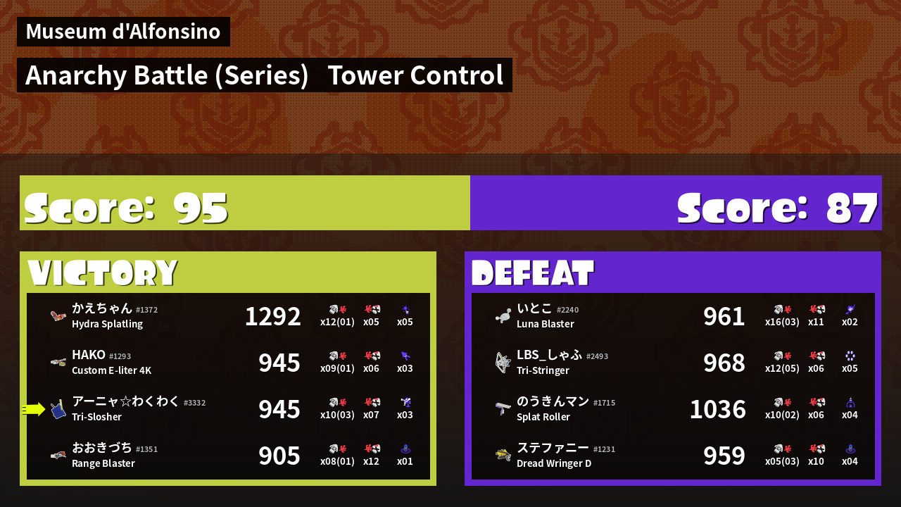 | Medals | Record-Score Setter #1 Splat Assister #1 Tower Stopper | ||