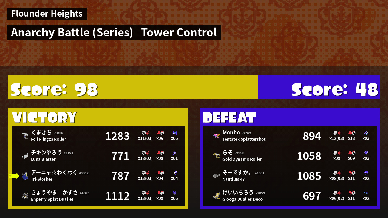| Medals | Record-Score Setter #1 Splat Assister #1 Tower Stopper | ||