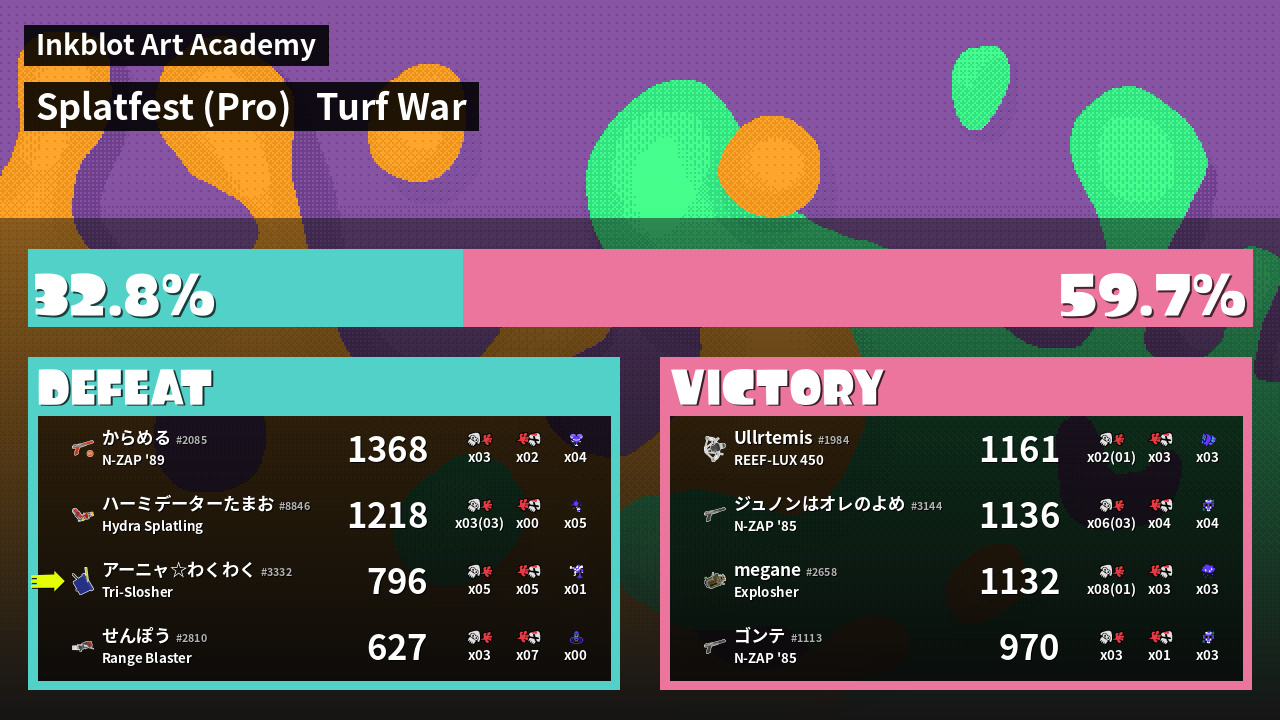 | Medals | #1 Overall Splatter #1 Home-Base Inker #1 Enemy-Base Inker | ||
