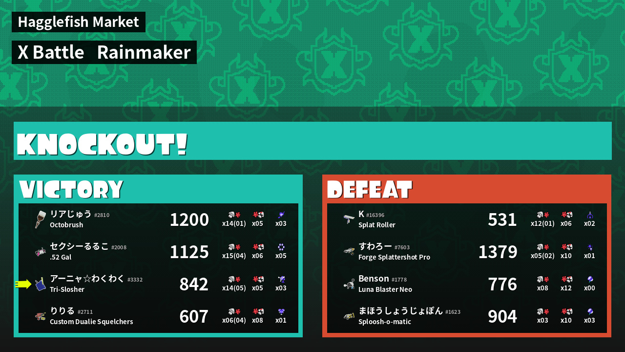 | Medals | #1 Score Booster #1 Splat Assister #1 Rainmaker Stopper | ||