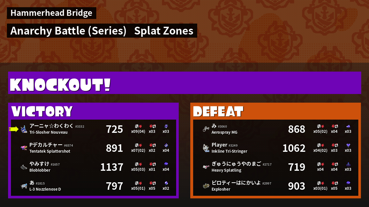 | Medals | #1 Overall Splatter #1 Splat Zone Guard #1 Enemy Splatter | ||