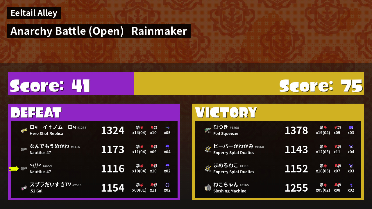 | Medals | #1 Super Jump Spot #1 Splat Assister #1 Rainmaker Carrier | ||