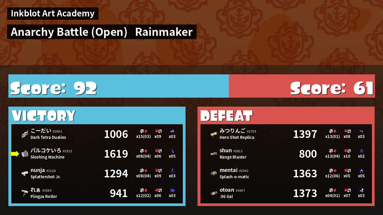 | Medals | #1 Turf Inker #1 Splat Assister #1 Ink Consumer | ||