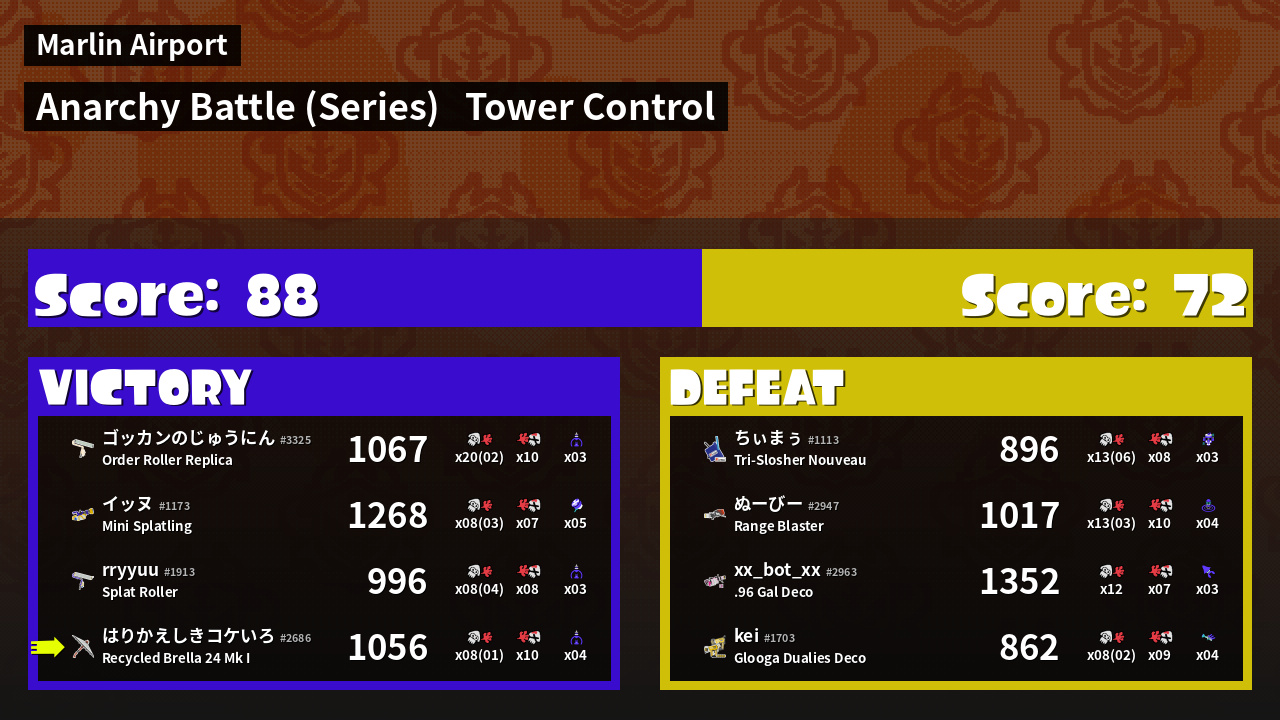 | Medals | #1 Tower Stopper #1 Big Bubbler User #2 Overall Splatter | ||