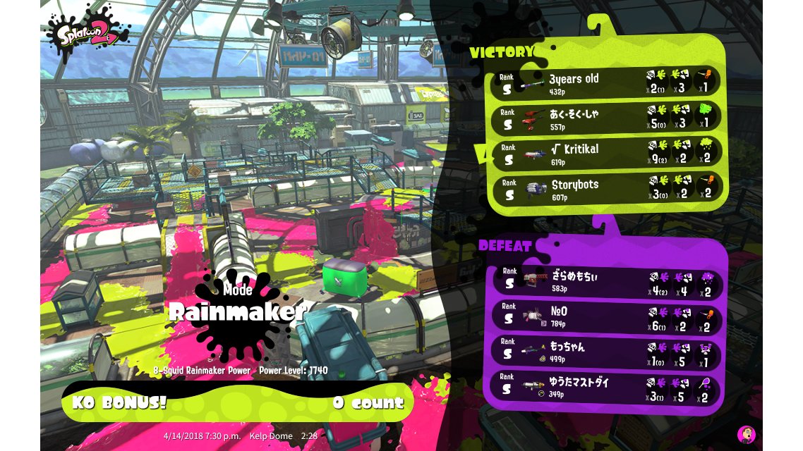| Weapon | Splattershot Pro ( Point Sensor, Ink Storm) |