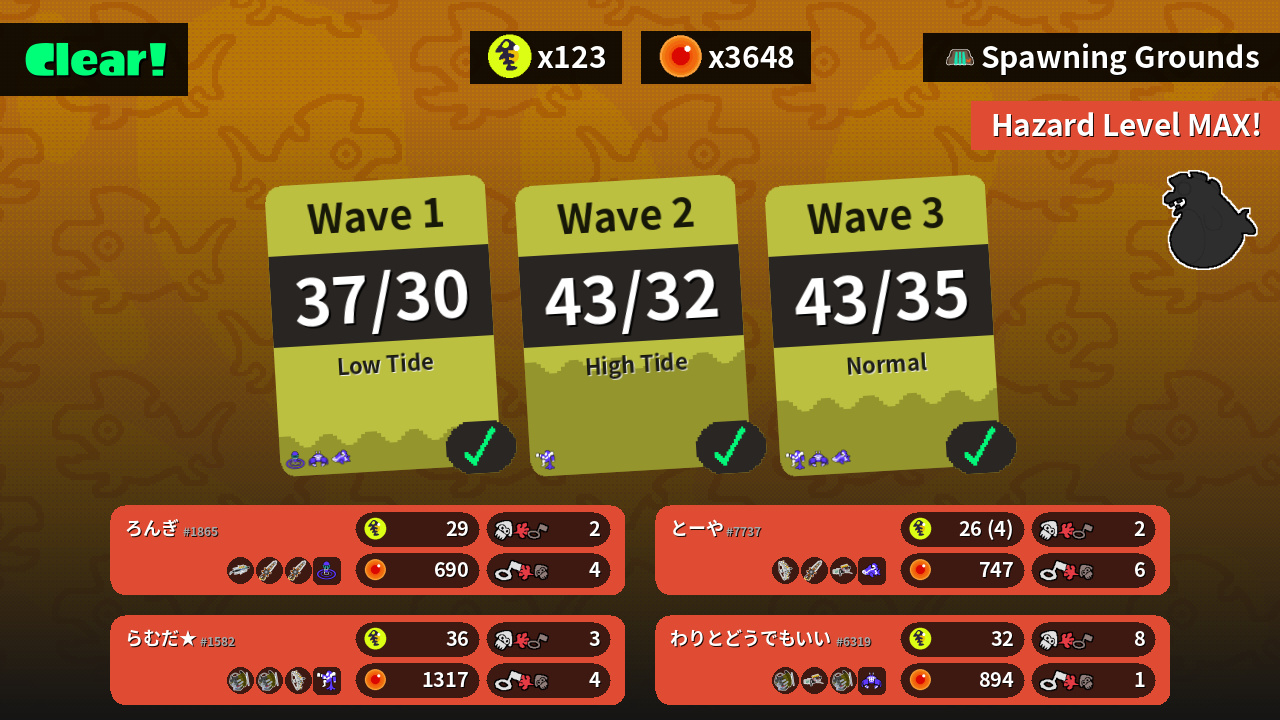 | Weapons | Grizzco Brella Grizzco Splatana Grizzco Splatana | Grizzco Slosher Grizzco Slosher Grizzco Stringer | Grizzco Slosher Grizzco Blaster Grizzco Slosher | Grizzco Stringer Grizzco Splatana Grizzco Blaster |