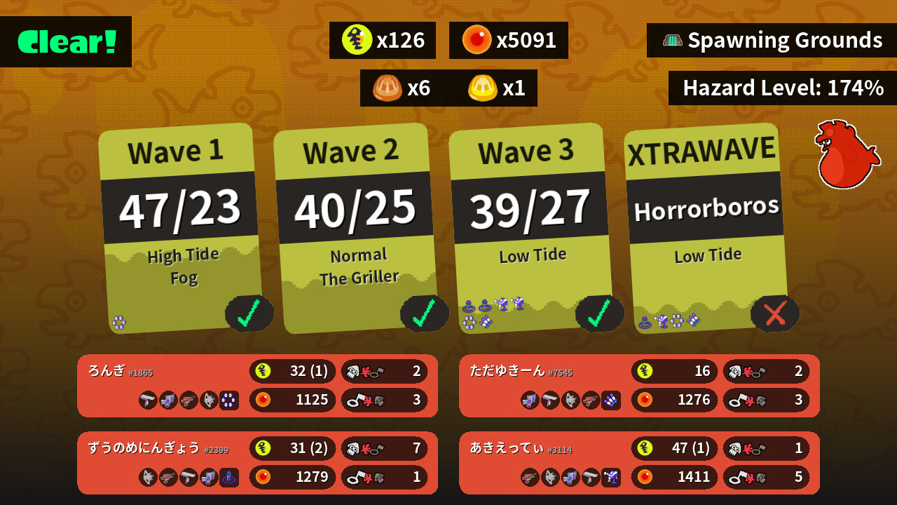 | Weapons | Splat Roller Glooga Dualies Dualie Squelchers Tri-Stringer | Dualie Squelchers Tri-Stringer Glooga Dualies Splat Roller | Tri-Stringer Dualie Squelchers Splat Roller Glooga Dualies | Glooga Dualies Splat Roller Tri-Stringer Dualie Squelchers |