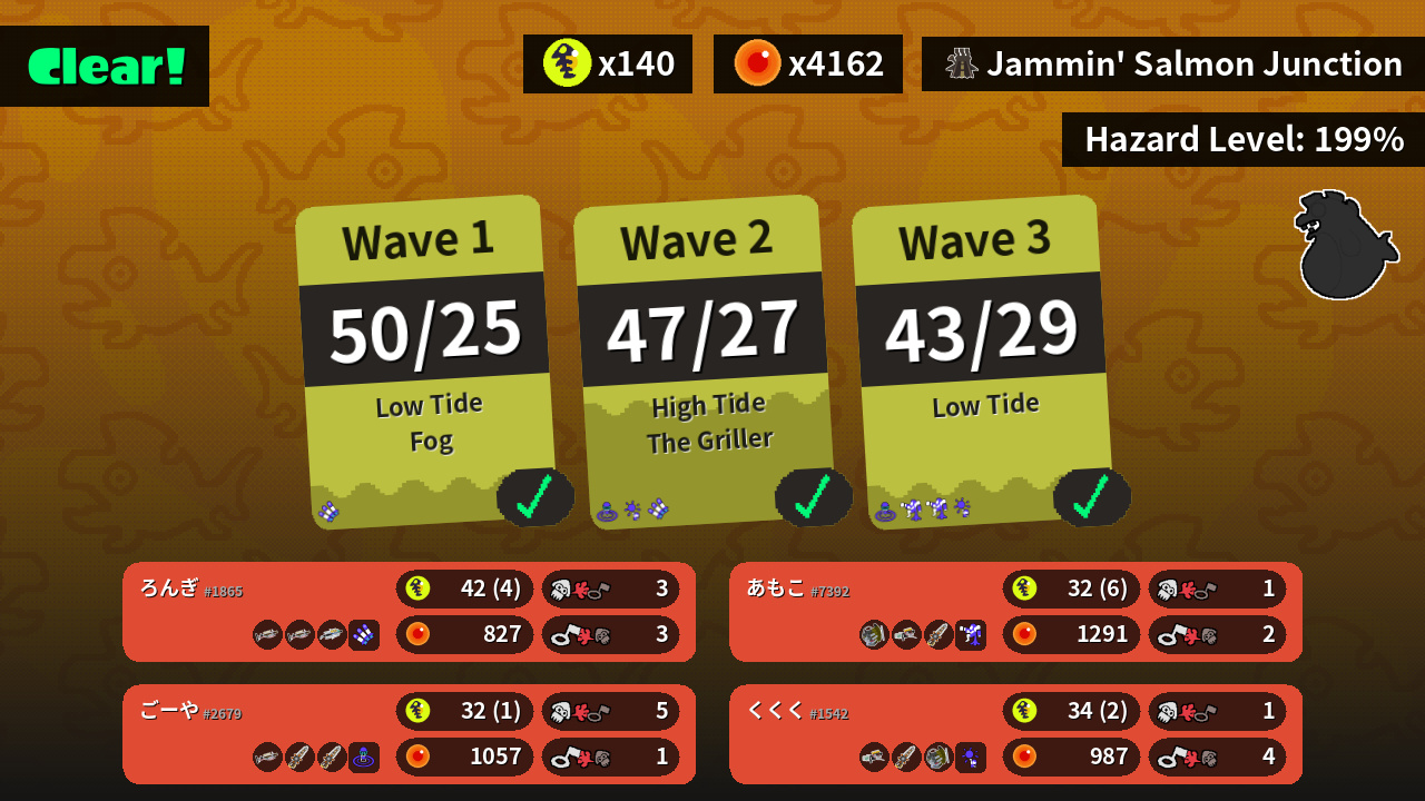 | Weapons | Grizzco Charger Grizzco Charger Grizzco Brella | Grizzco Blaster Grizzco Splatana Grizzco Slosher | Grizzco Slosher Grizzco Blaster Grizzco Splatana | Grizzco Charger Grizzco Splatana Grizzco Splatana |