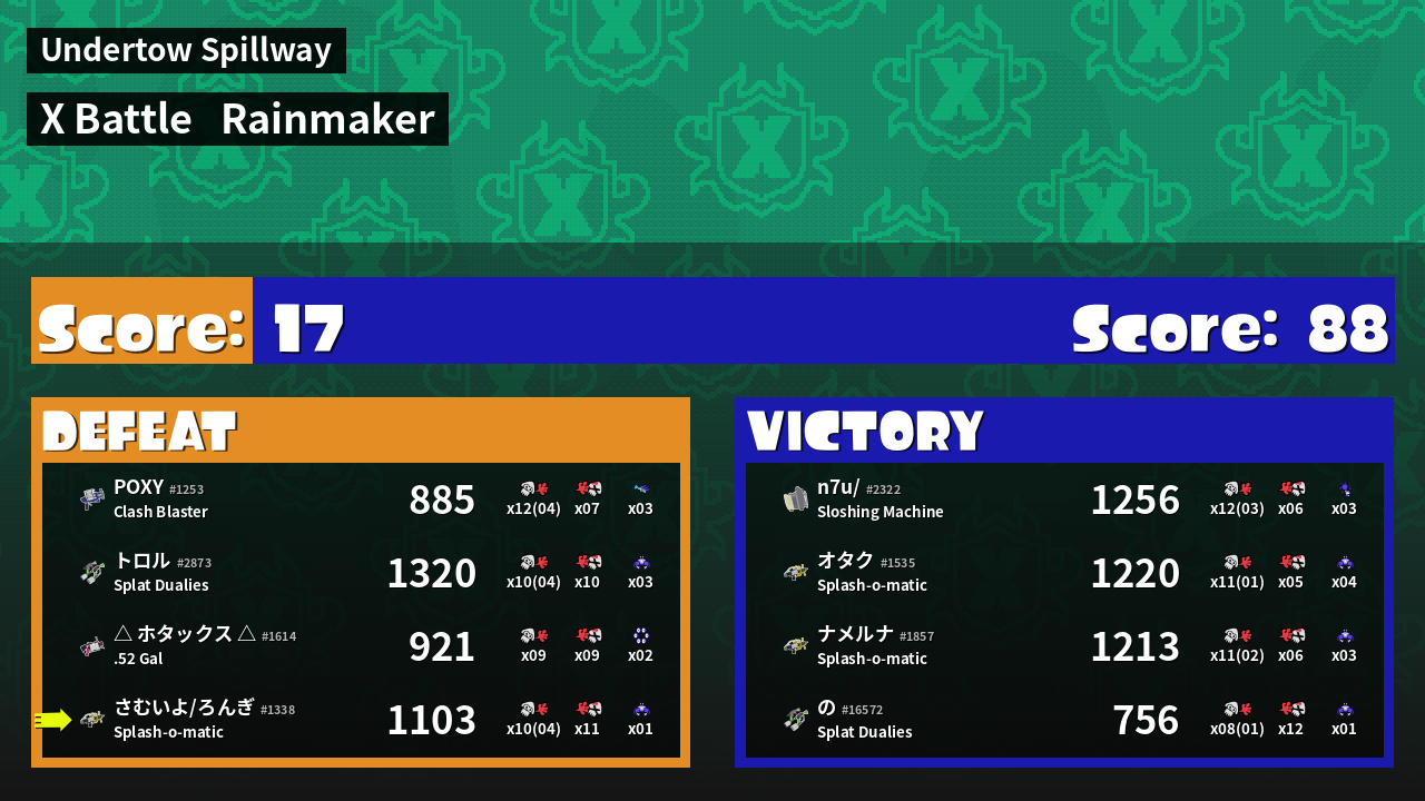| Medals | #1 Super Jump Spot #1 Splat Assister #1 Crab Tank User | ||