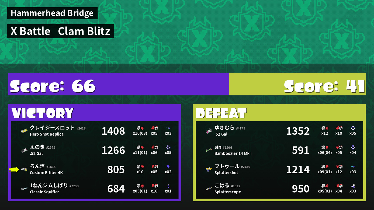 | Medals | #1 Clam Carrier #1 Enemy Splatter #1 Kraken Royale User | ||