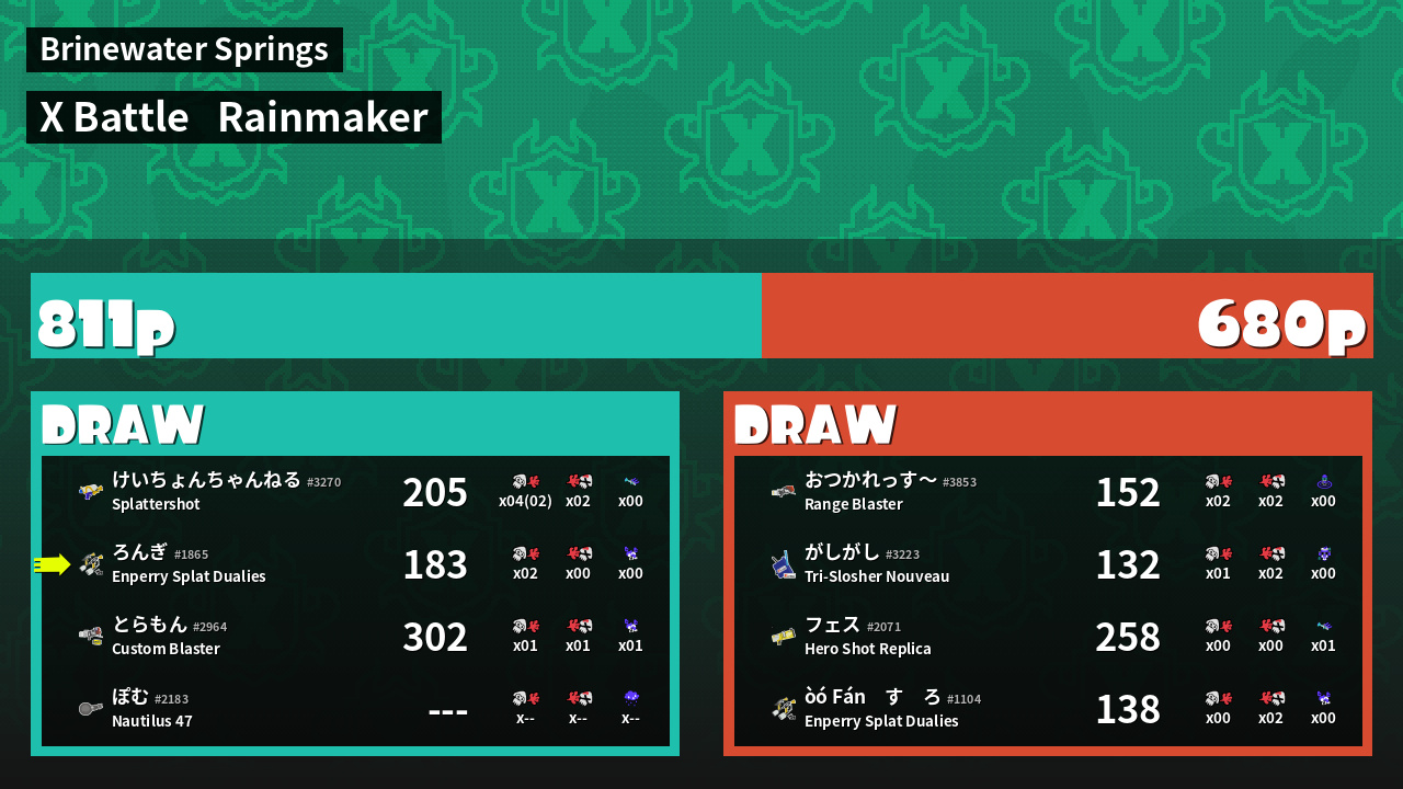 | Weapon | Enperry Splat Dualies ( Curling Bomb / Triple Splashdown) | ||