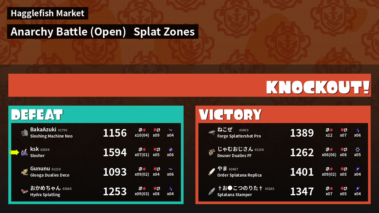 | バンカラな若者  ねこぜ  #2403 |  Forge Splattershot Pro                    | 1,389 | 12 + 0 | 7 | 1.71 |  6 | |
