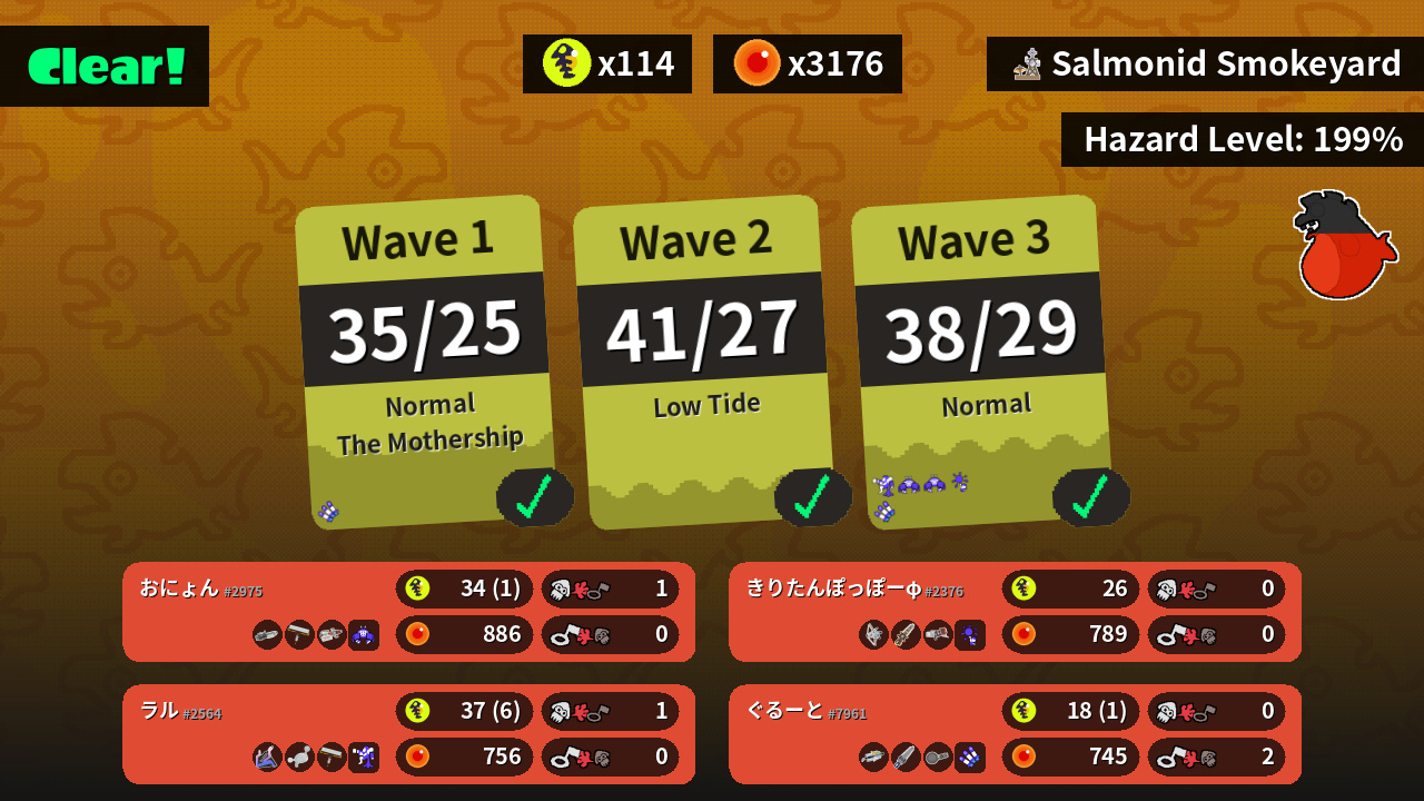 | Weapons | Ballpoint Splatling Carbon Roller Heavy Edit Splatling | Slosher Luna Blaster Carbon Roller | Tri-Stringer Grizzco Splatana Blaster | Grizzco Brella Splatana Stamper Nautilus 47 |
