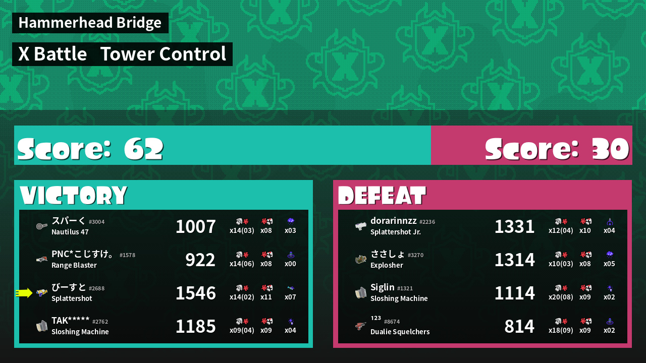 | Medals | #1 Overall Splatter #1 Turf Inker #1 Enemy Splatter | ||