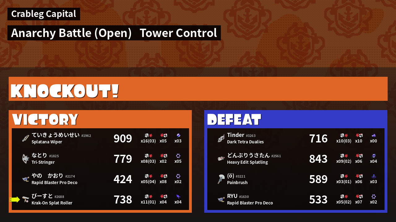 | Medals | #1 Ground Traveler #1 Kraken Royale User #2 Overall Splatter | ||