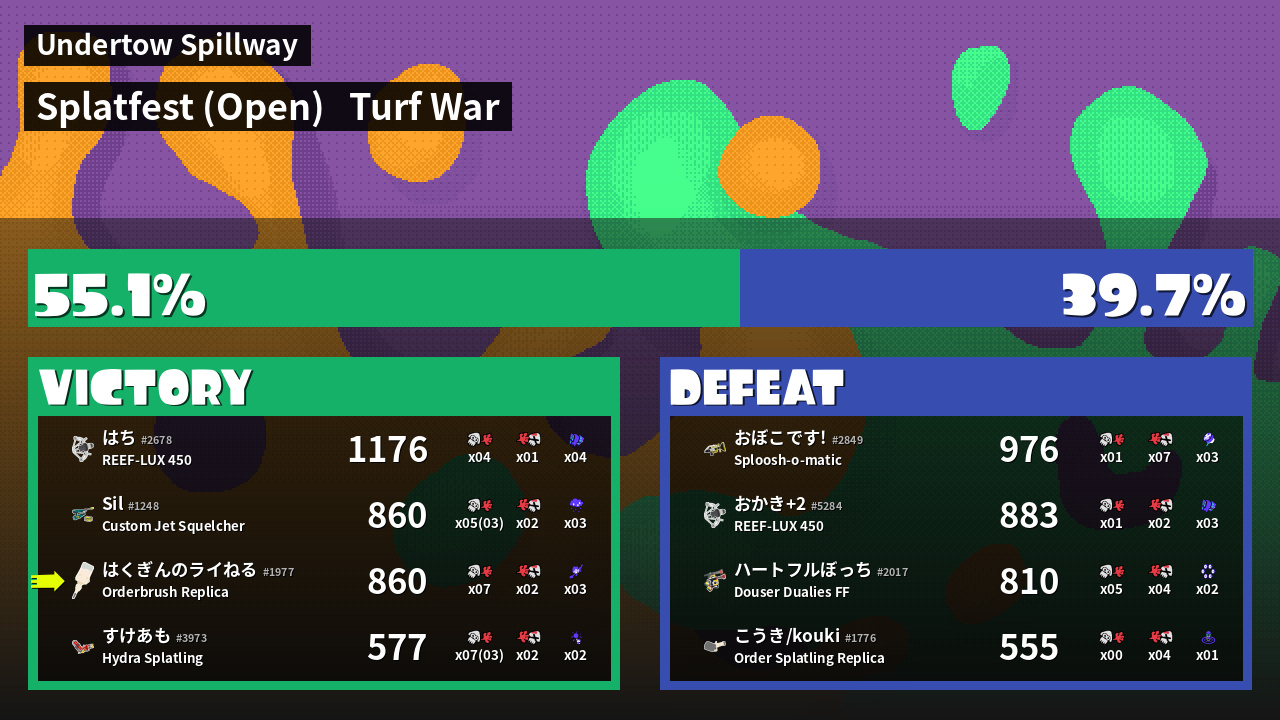 | Medals | #1 Overall Splatter #1 Enemy-Base Inker #1 Enemy Splatter | ||