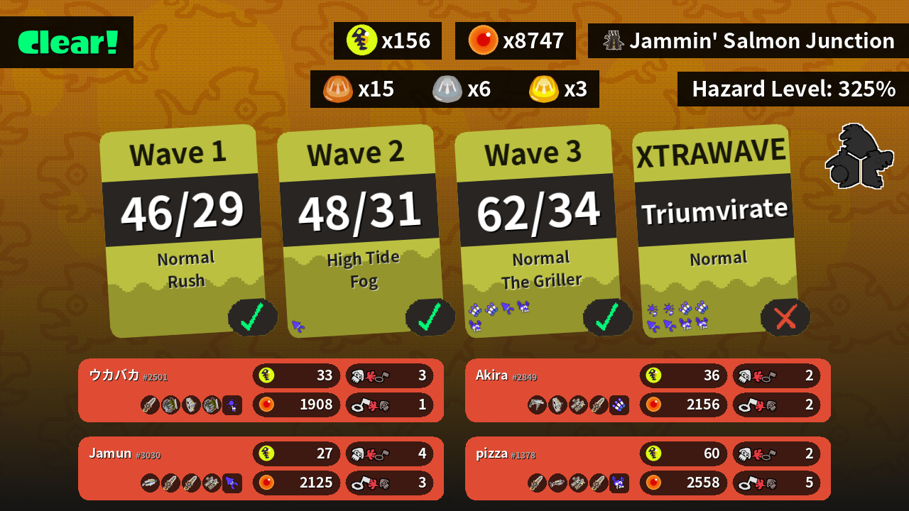 | Weapons | Grizzco Splatana Grizzco Slosher Grizzco Stringer Grizzco Slosher | Grizzco Splatana Grizzco Charger Grizzco Dualies Grizzco Splatana | Grizzco Roller Grizzco Stringer Grizzco Dualies Grizzco Splatana | Grizzco Brella Grizzco Splatana Grizzco Splatana Grizzco Dualies |