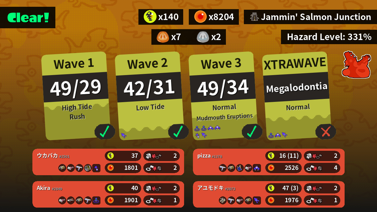 | Weapons | Splash-o-matic Heavy Splatling Big Swig Roller Grizzco Slosher | Grizzco Dualies Big Swig Roller Heavy Splatling Splash-o-matic | Heavy Splatling Range Blaster Splash-o-matic Big Swig Roller | Big Swig Roller Splash-o-matic Tri-Slosher Heavy Splatling |