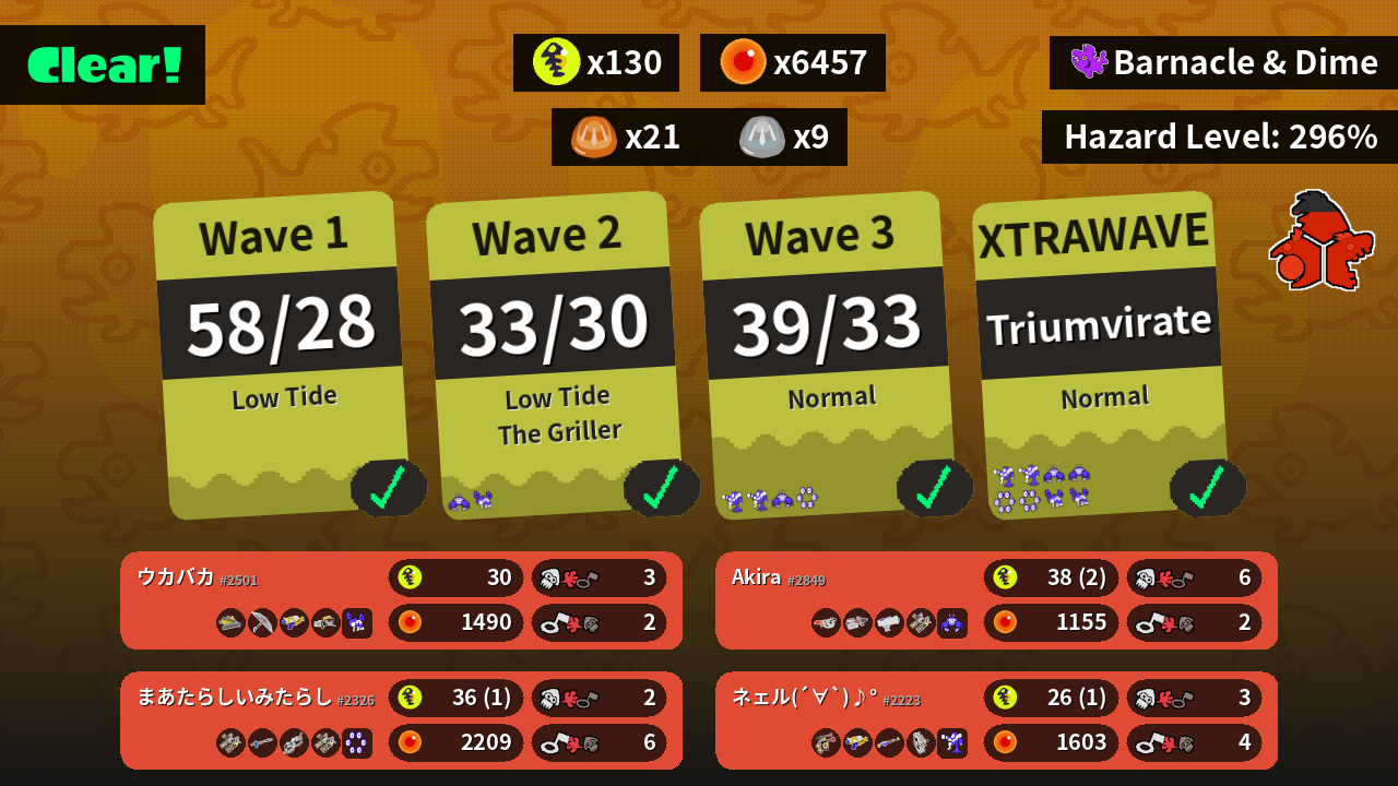 | Weapons | Dread Wringer Splat Brella Splattershot Grizzco Blaster | Goo Tuber Heavy Edit Splatling Splattershot Jr. Grizzco Dualies | Grizzco Dualies Snipewriter 5H Dark Tetra Dualies Grizzco Dualies | Douser Dualies FF Splattershot Splat Charger Grizzco Stringer |