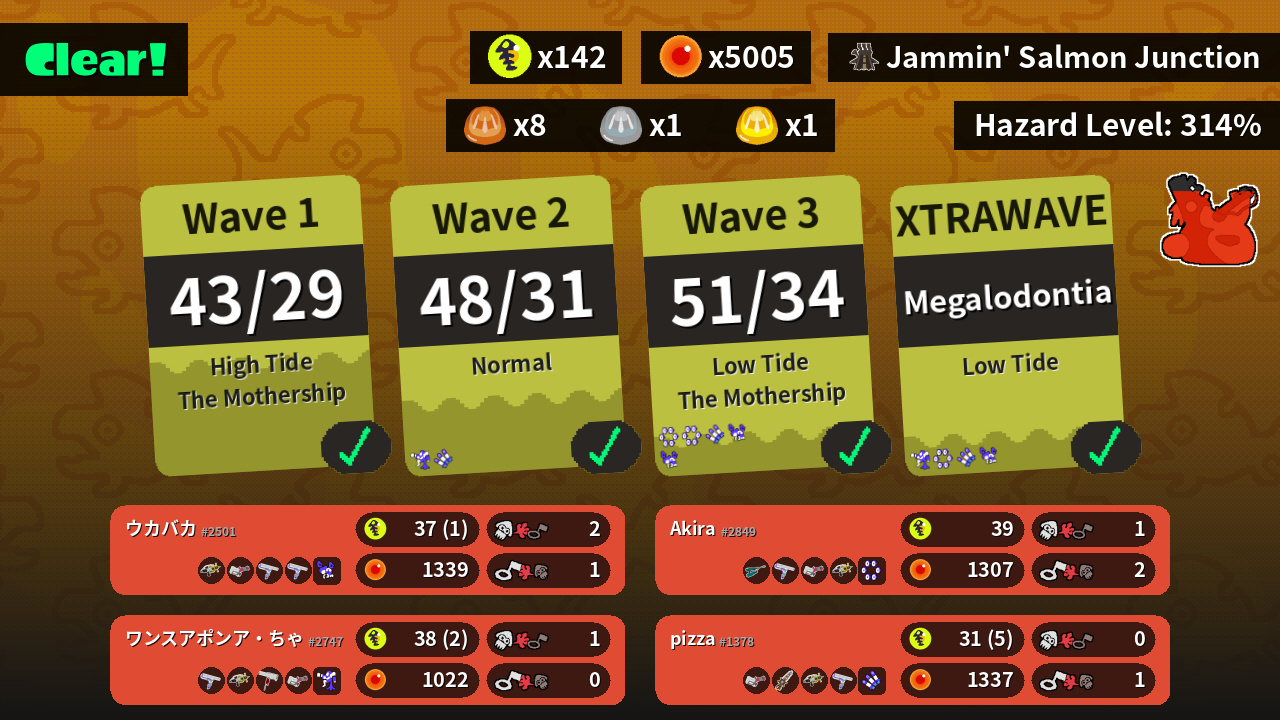 | Weapons | Splash-o-matic Heavy Splatling Big Swig Roller Big Swig Roller | Jet Squelcher Big Swig Roller Heavy Splatling Splash-o-matic | Big Swig Roller Splash-o-matic Flingza Roller Heavy Splatling | Heavy Splatling Grizzco Splatana Splash-o-matic Big Swig Roller |