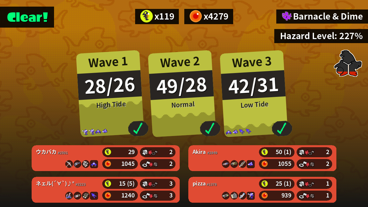 | Weapons | Recycled Brella 24 Mk I H-3 Nozzlenose REEF-LUX 450 | Splattershot Pro Sploosh-o-matic Splatana Wiper | Splattershot Nova Sloshing Machine Mint Decavitator | Slosher .96 Gal Splat Dualies |