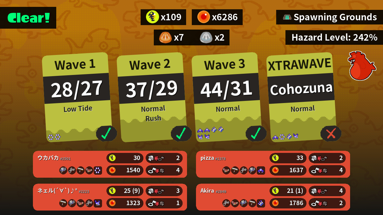 | Weapons | Clash Blaster Aerospray MG Carbon Roller Hydra Splatling | Hydra Splatling Carbon Roller Aerospray MG Clash Blaster | Carbon Roller Clash Blaster Hydra Splatling Aerospray MG | Aerospray MG Hydra Splatling Clash Blaster Carbon Roller |