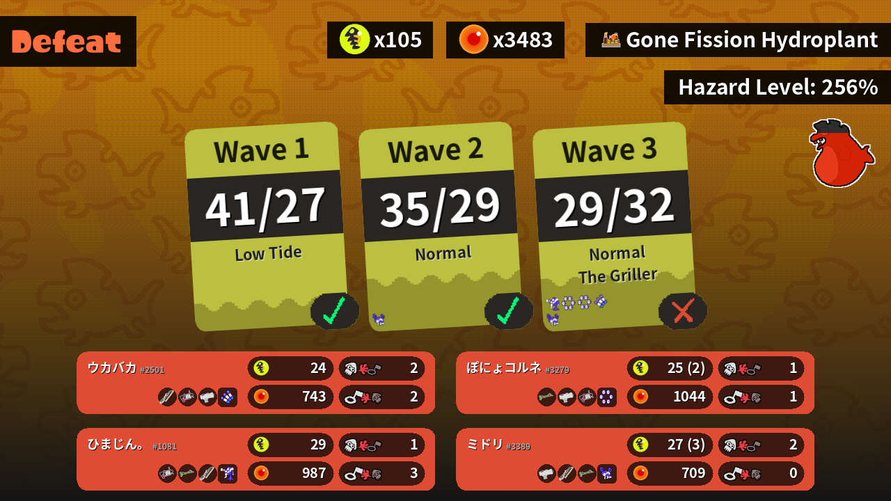 | Weapons | Splatana Wiper .52 Gal Splattershot Jr. | .52 Gal Bamboozler 14 Mk I Splatana Wiper | Splattershot Jr. Splatana Wiper Bamboozler 14 Mk I | Bamboozler 14 Mk I Splattershot Jr. .52 Gal |