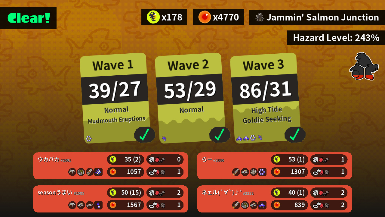| Weapons | Grizzco Roller Grizzco Slosher Grizzco Splatana | Grizzco Splatana Grizzco Blaster Grizzco Dualies | Grizzco Roller Grizzco Blaster Grizzco Charger | Grizzco Splatana Grizzco Slosher Grizzco Blaster |