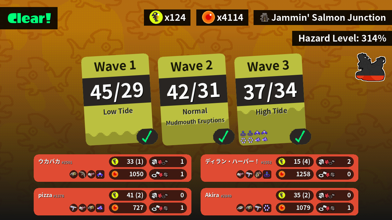 | Weapons | Splash-o-matic Tenta Brella Heavy Splatling | Big Swig Roller Heavy Splatling Splash-o-matic | Grizzco Brella Splash-o-matic Big Swig Roller | Heavy Splatling Big Swig Roller Douser Dualies FF |