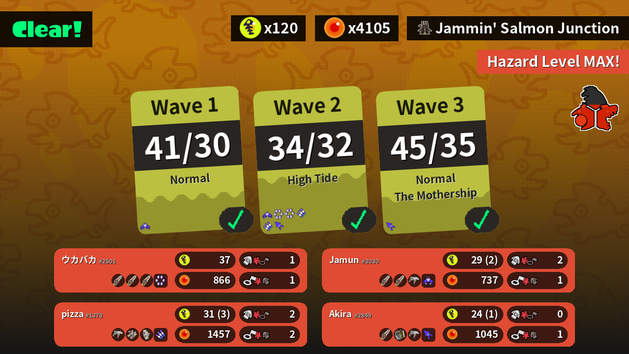 | Weapons | Grizzco Splatana Grizzco Splatana Grizzco Splatana | Grizzco Roller Grizzco Dualies Grizzco Stringer | Grizzco Splatana Grizzco Splatana Grizzco Roller | Grizzco Splatana Grizzco Slosher Grizzco Roller |