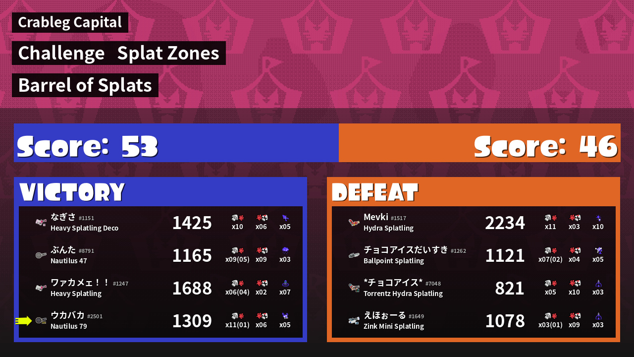 Challenge | Barrel of Splats Muster as much firepower as you can<br />in this battle of the splatlings! | ||