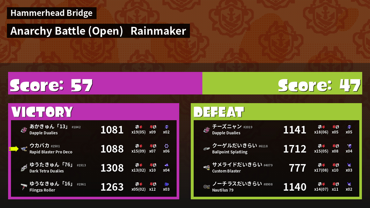 | Medals | #1 Super Jump Spot #1 Splat Assister #1 Damage Taker | ||