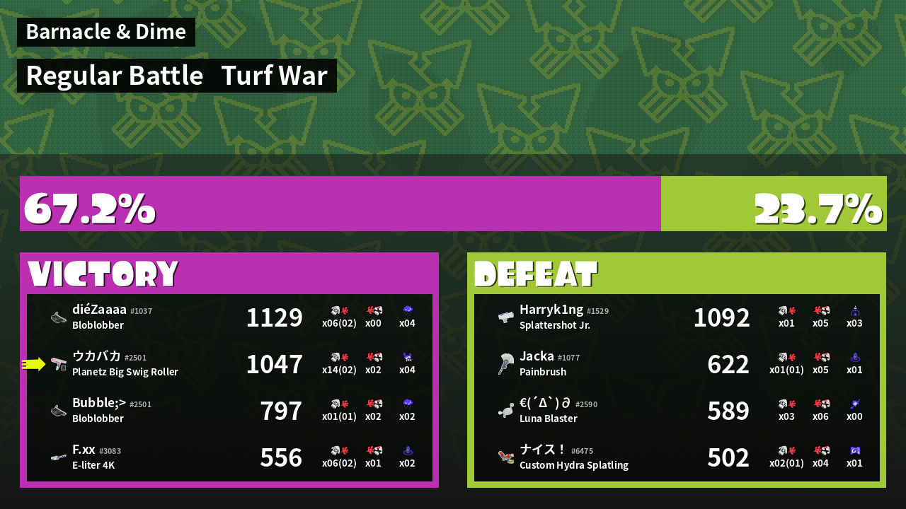 | Medals | #1 Overall Splatter #1 Popular Target #1 Enemy-Base Inker | ||