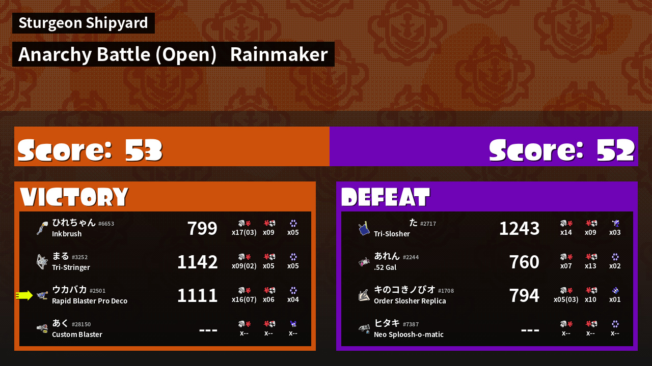 | Medals | #1 Splat Assister #1 Rainmaker Carrier #2 Overall Splatter | ||
