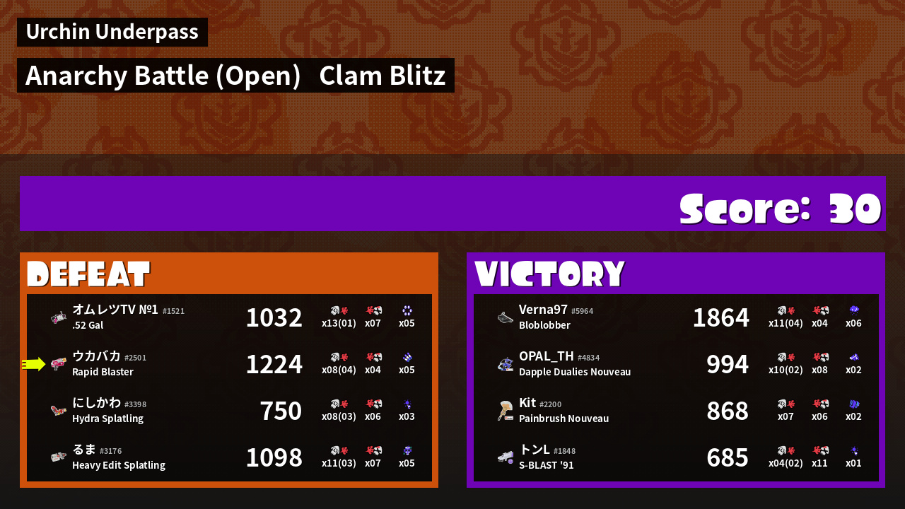 | Mode | Clam Blitz - Anarchy Battle (Open) | ||