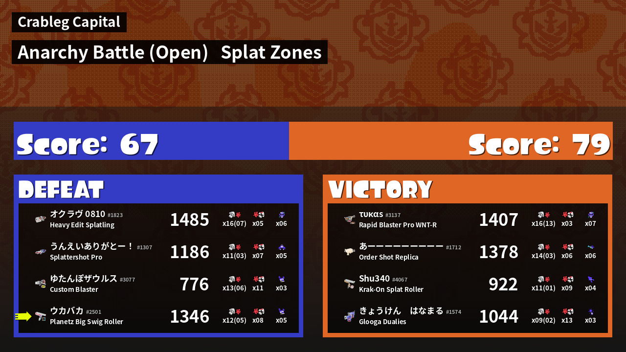 | Mode | Splat Zones - Anarchy Battle (Open) | ||