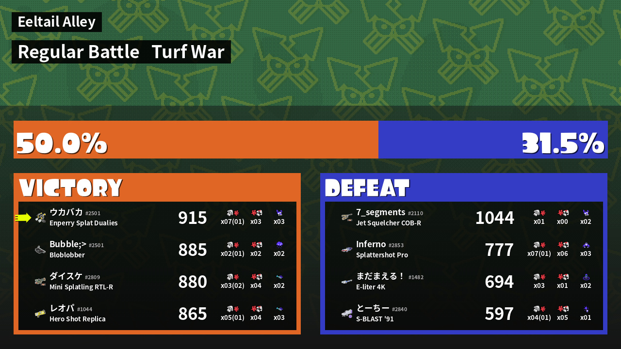 | Weapon | Enperry Splat Dualies ( Curling Bomb / Triple Splashdown) | ||