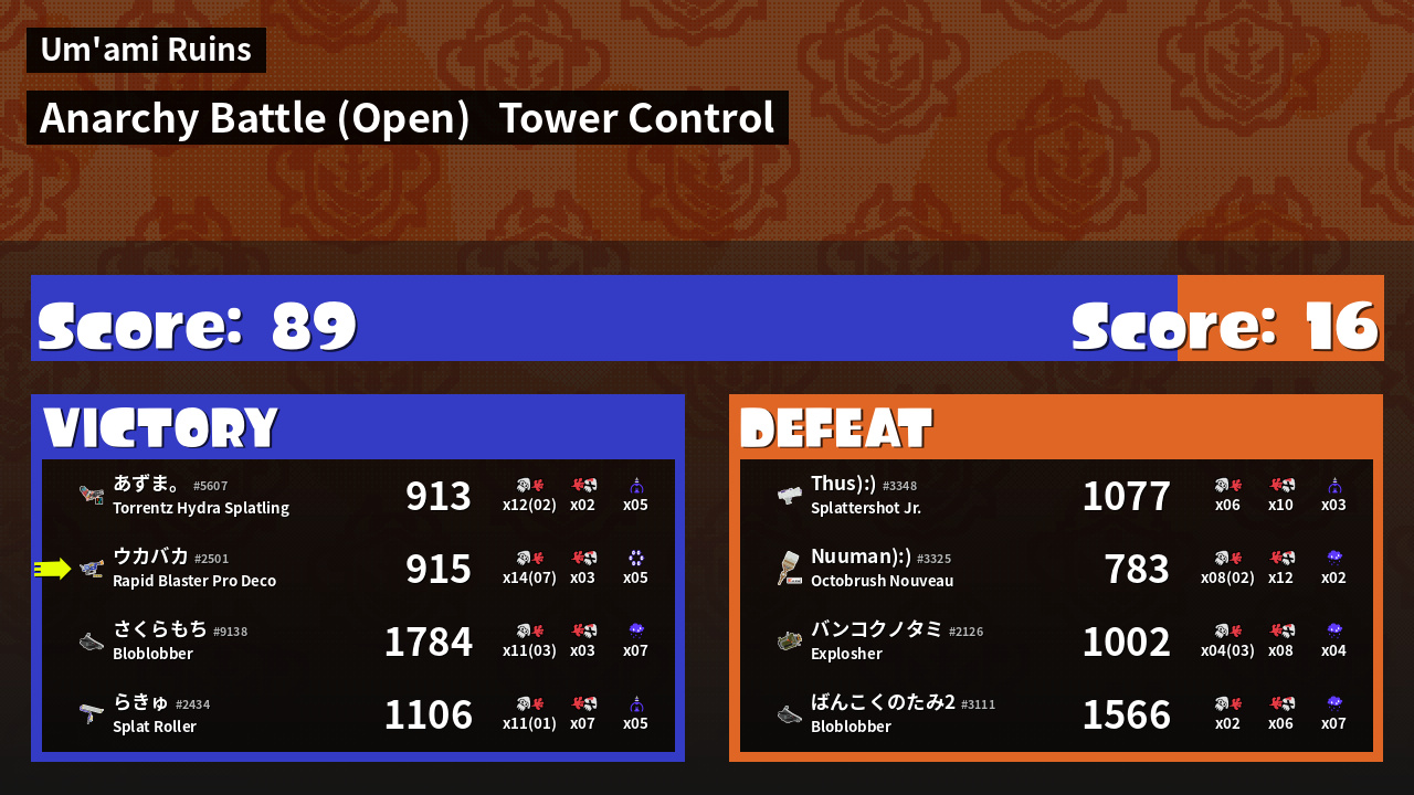 | Medals | #1 Overall Splatter #1 Splat Assister #1 Tower Stopper | ||