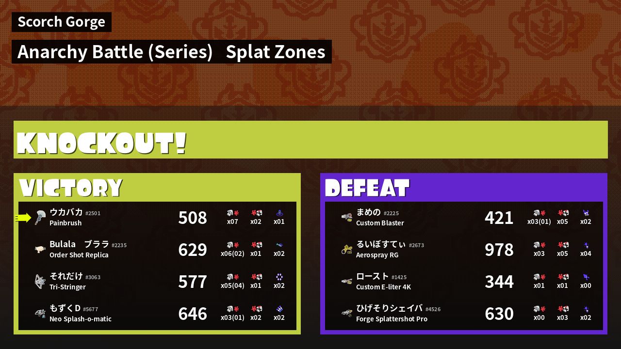 | Medals | #1 Overall Splatter #1 Splat Zone Guard #1 Enemy Splatter | ||