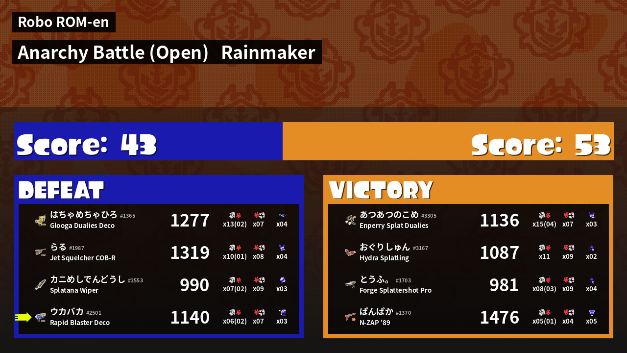 | Medals | #1 Splat Assister #1 Rainmaker Stopper #1 Ink Consumer | ||