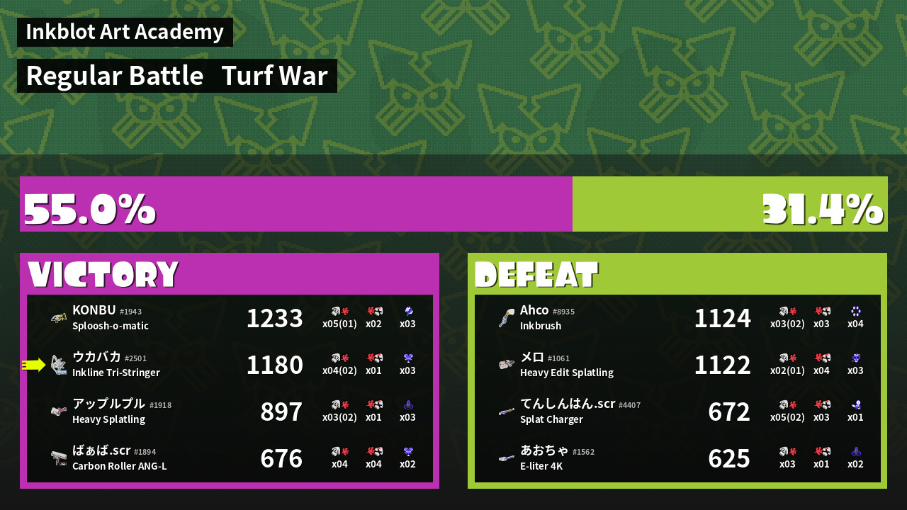 | Medals | #1 Enemy-Base Inker #1 Splat Assister #1 Super Chump User | ||